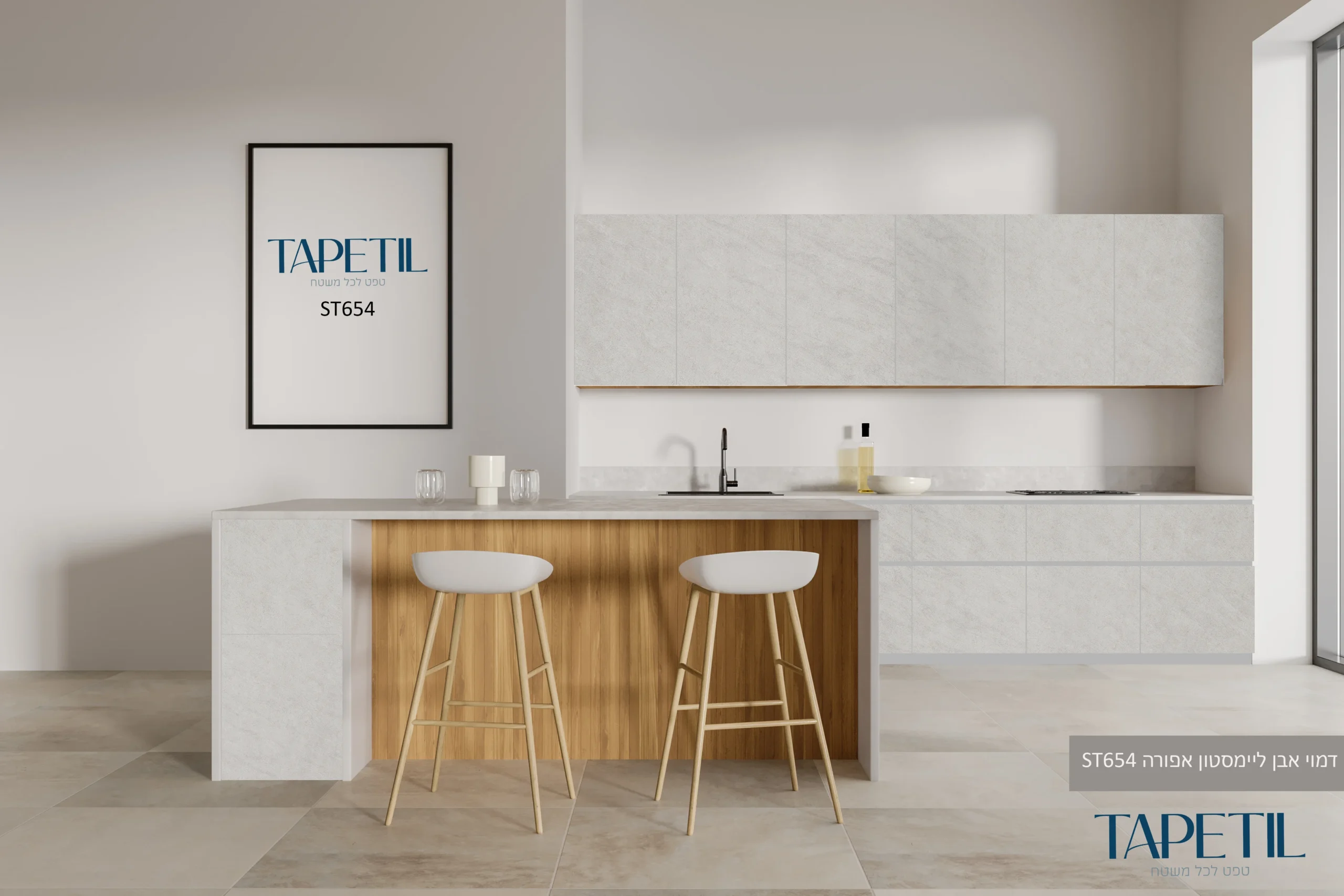 הטפט מדמה את מראה הליימסטון בגוון אפור בהיר עם טקסטורה מינרלית מאופקת. המראה הנקי והעדין משתלב נהדר במטבחים מודרניים וסקנדינביים.